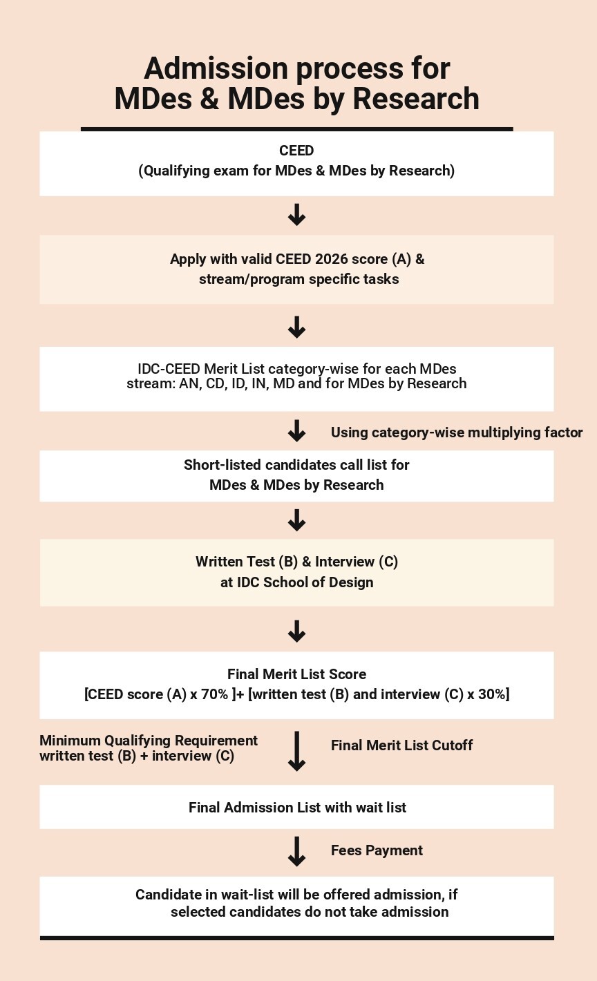 - All candidates who have qualified CEED 2025 and meet the eligibility criteria of each stream can apply for admission to MDes for various streams (AN, CD, ID, IN, and MD) in IDC School of Design, IIT Bombay.
