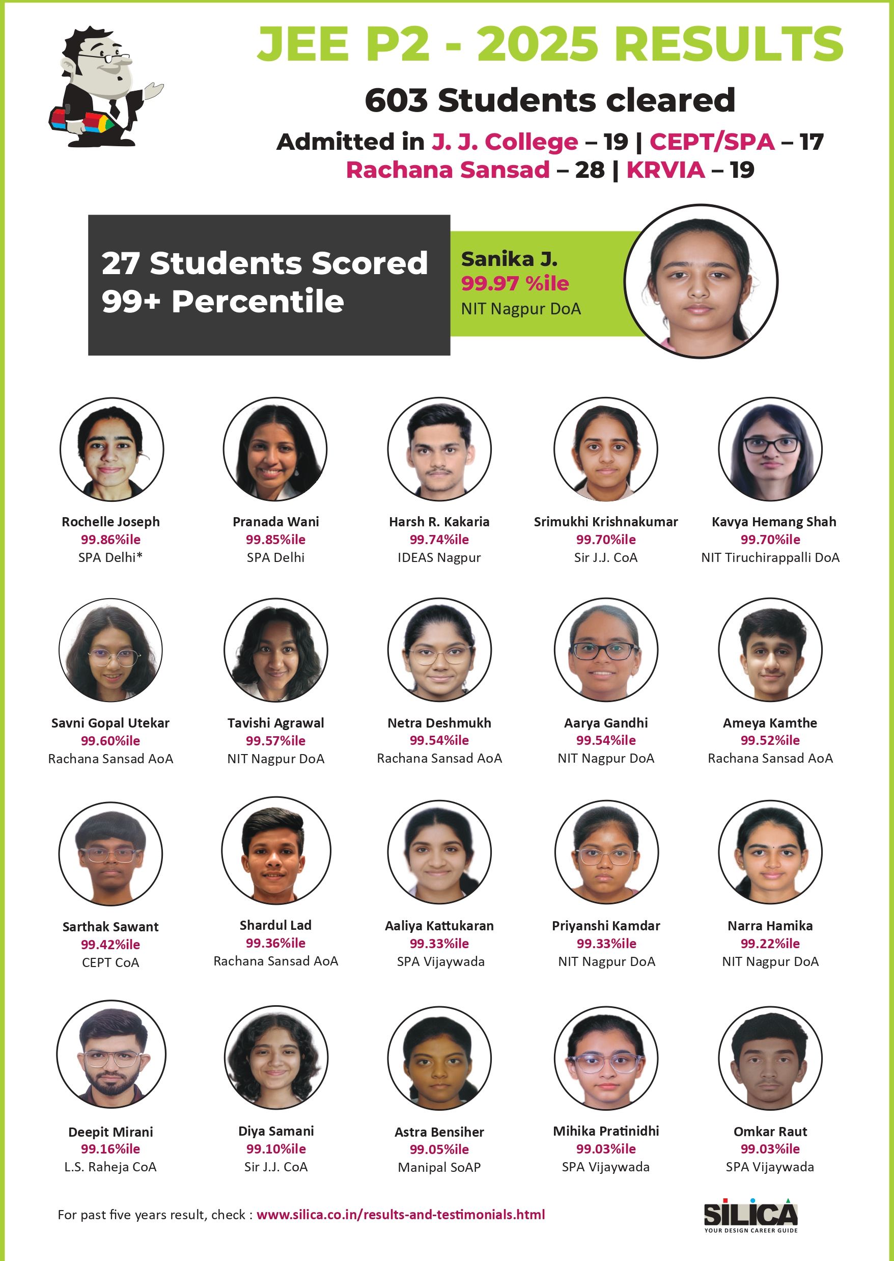 SILICA conducts 2 Year, 1 Year, Crash Course coaching for NATA & JEE exam preparation. In the last 5 years, 3722 SILICA students have cleared the NATA entrance exam and 1769 have cleared the JEE Paper 2 exam. In 2023, 711 SILICA students cracked NATA and 455 cleared JEE Paper 2.