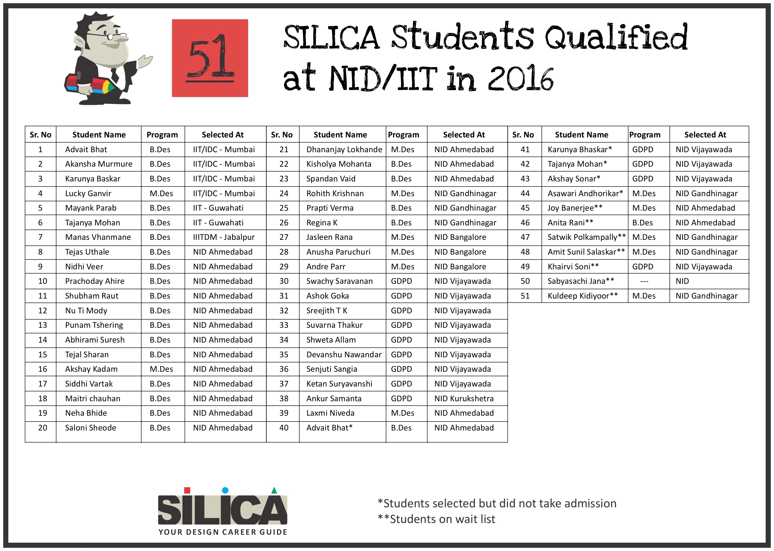 Everything was going smooth enough but suddenly we met with an problem that NID has changed its DAT pattern. But SILICA was always one step ahead. Within a short span of time SILICA moulded us within the new pattern and now we were confident enough. … I would like to suggest to all my dear friends who are preparing for NID, that don’t try to miss even a single lecture, try to complete all your homeworks on time and work hard for it.