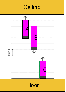 | Q.1. A diagram of three blocks A, B and C, and their direction of movement is shown below. The blocks move continuously in given units and change direction after hitting the floor or ceiling. Block A moves 3 units/second, Block B moves 2 units / second, and Block C moves 1 unit/second. What is the least time (in seconds) required for the bottom (shaded portion) of at least 2 blocks to align at the same level? (NAT Type, 4.0 marks)