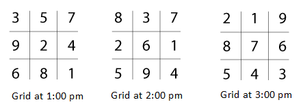 The son has a habit of opening his phone every hour using a similar grid, but with numbers. To make the task even more difficult for the father, he updates the grid every hour using a mathematical algorithm. The grid at 1:00 pm, 2:00 pm and 3:00 pm are as follows.